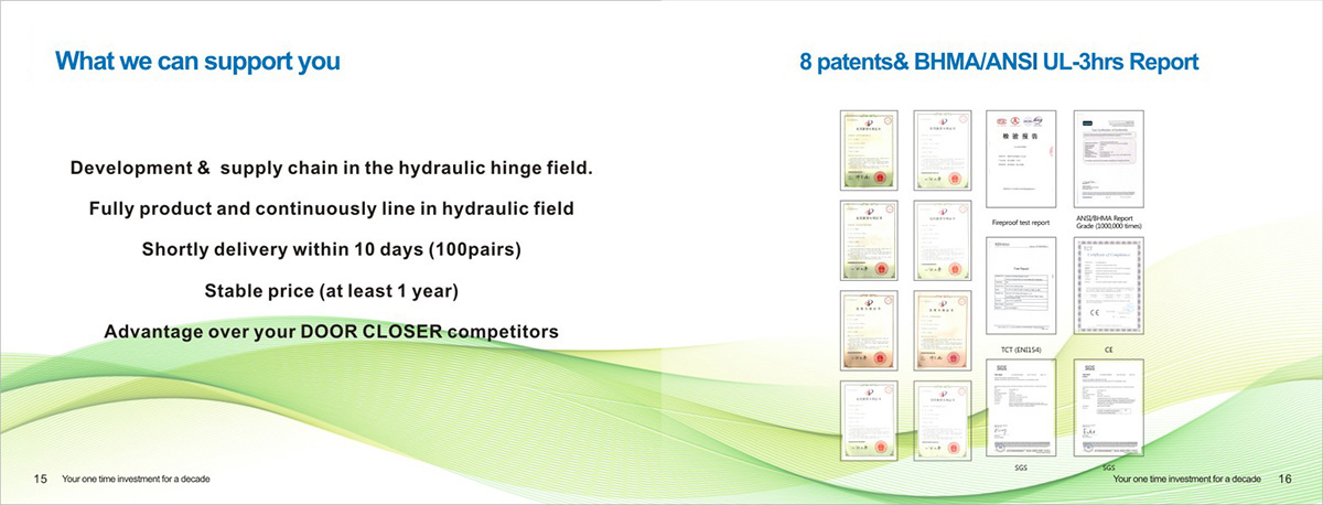 Structure ,material and producing …With 8 patents in the key spare part create a new revolution of door auto closing filed. The only one manufacture focus on hydraulic hinge. Key spare part produce by own and with patents.